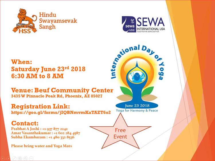 Hindu swayamsevak Sangh and SEWA International celebrate the spirit of yoga. To promote awareness and encourage Arizonans do embrace yoga, a workshop is being conducted by trained and certified Yoga teachers.