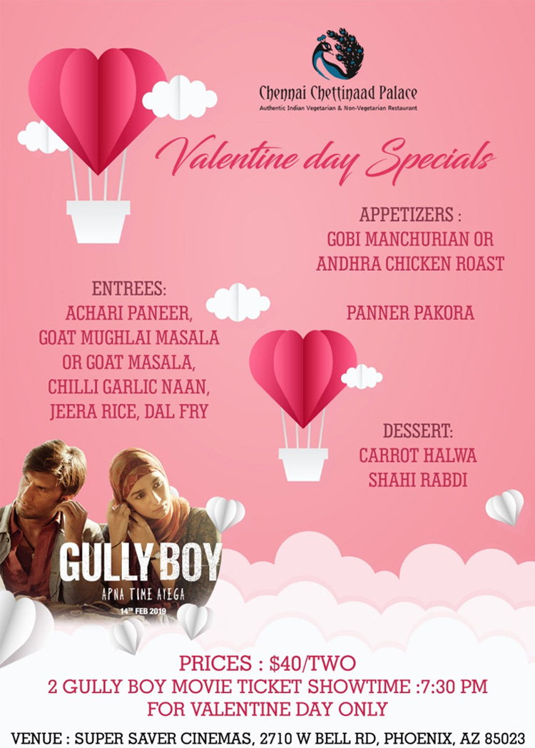 Show your love with special Valentine in your life, romantic date night dinner at Chennai and decadent Rabdi dessert. Plus 2 Gully Boy tickets for premier show.