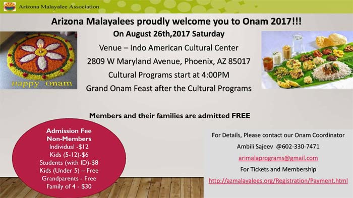 When: August 26th Saturday 4:00 pmWhere: Indo American Cultural centerFor More Details Please Contact Program Coordinator Ambili Sajeev 602-330-7471