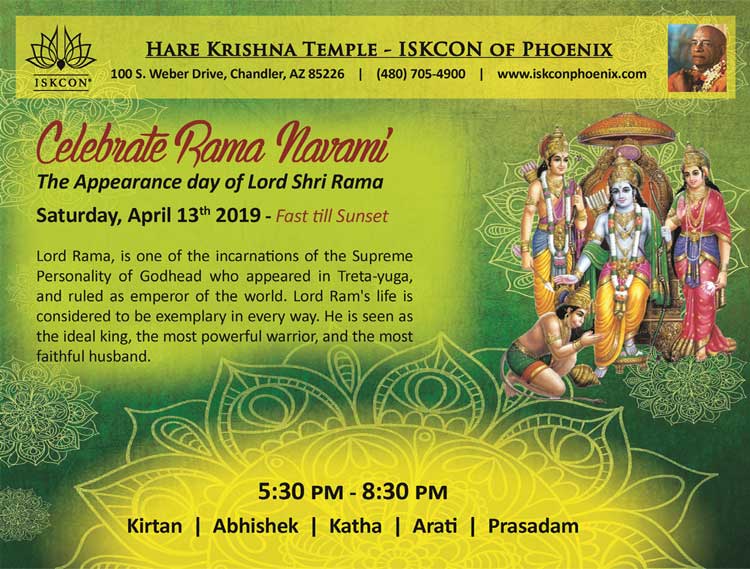 Ram Navami - April 13th Appearance Day of Lord Ramchandra 5:30 PM - 8:30 PM Fasting till Sunset Kirtan, Abhishek, Katha, Arati, Prasadam