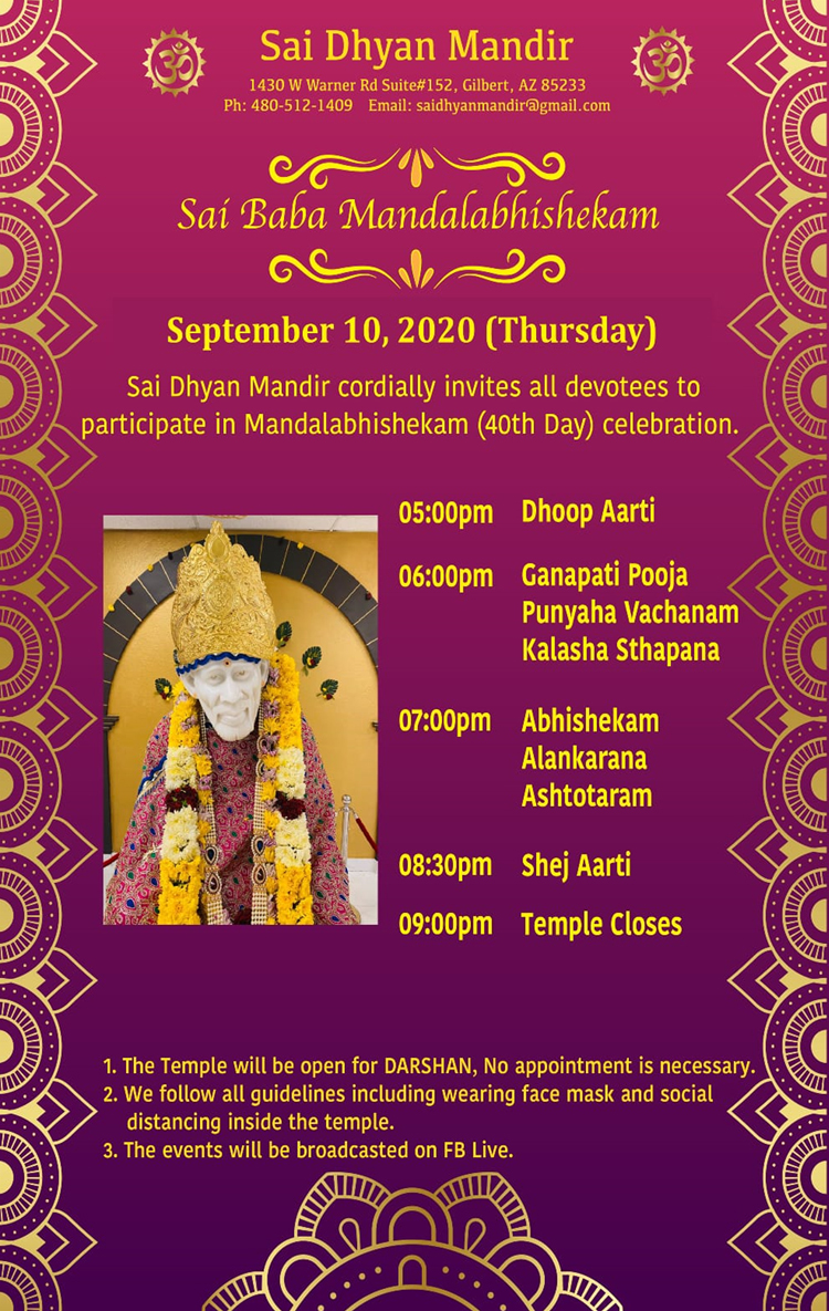 Sai Dhyan Mandir cordially invites all devotees to participate in the Mandalabhishekam celebrations (40th Day after Prathista) on Thursday, September 10th, 2020. Attached is the detailed event schedule. We recommend sign ups for Abhishekam participation.