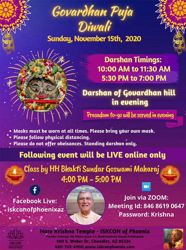 ISKON of Phoenix invites you for Darshan of Govardhan Hill in the evening and Live Online Class by