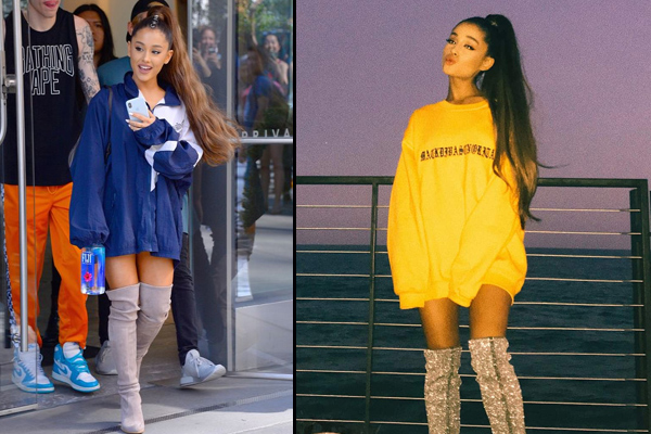 Just like Ariana, if you choose to do so, you can pair your sweater dress with boots or heels along with a sleek high pony tail or bun.