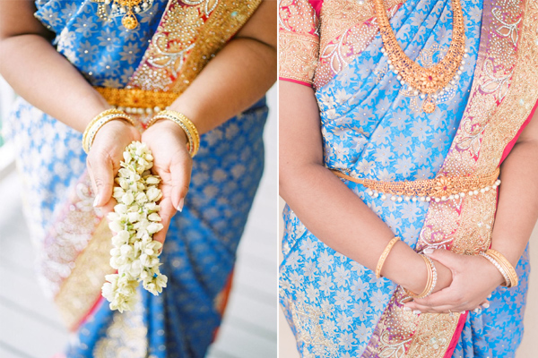 Sudha described her bouquet as “basically an explosion of springtime flowers,” and embraced her heritage by wearing a colorful sari. She completed the look with her hair pulled back in an elegant updo accessorized with a Maang Tikka.