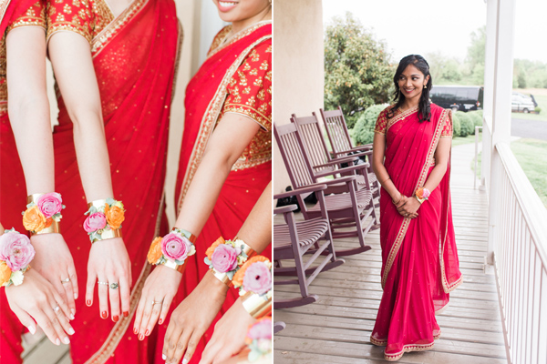 In lieu of bridesmaid bouquets, the bride had her ‘maids wear custom floral cuffs instead.