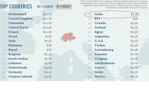 The leaked HSBC list of Swiss bank account holders from over 200 countries, showing better rank for Indians, with USD 4.1 billion in 16th position. The list, prepared by International Consortium of Investigative Journalists, comprises over one lakh HSBC customers and their bank accounts with balances totaling over USD 100 billion.